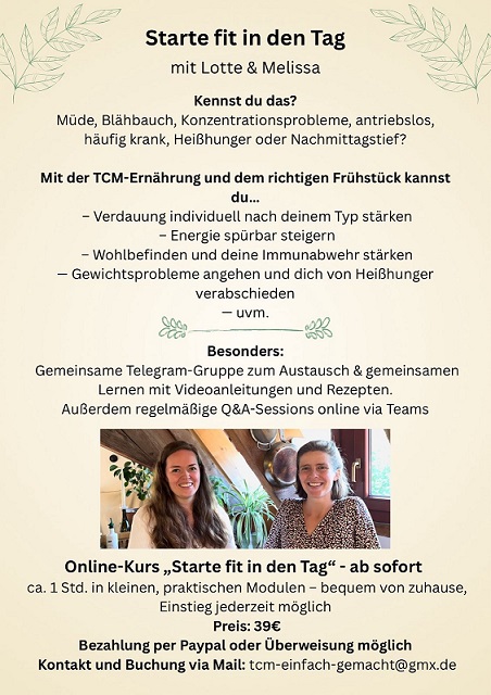 Durch die positive und heilende Unterstützung, die ich durch die TCM erfahren durfte, entschied ich mich für eine berufsbegleitende Ausbildung in der Ernährungsberatung beim Avicenna Institut in Freiburg.